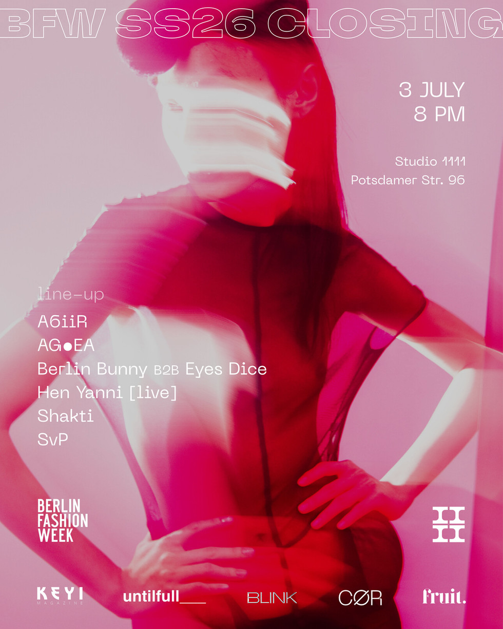 BFW SS26 Closing Party July 3, 2025 | 20:00–05:00 | Studio IIII, Berlin Five visionary collectives - KEYI x CØR x UNTILFULL x fruit x BLINK - unite for a powerful Berlin Fashion Week closing night at Studio IIII.